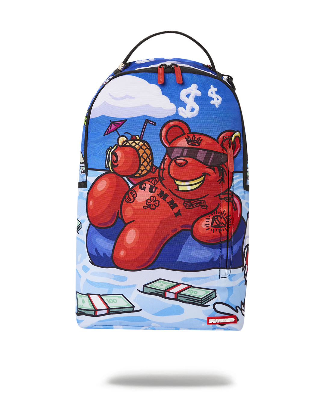 ExteriorDimensions: 18" x 6" x 11.5" • Front zipper pocket • Side pockets • Zippered Stash pocket • Separate velour sunglass compartment • Ergonomic mesh back padding • Adjustable Straps for custom sizing • Green zippers with metal hardware • Metal "Sprayground Authentic" badge • Slide through back sleeve connects to carry on luggage to free your hands
